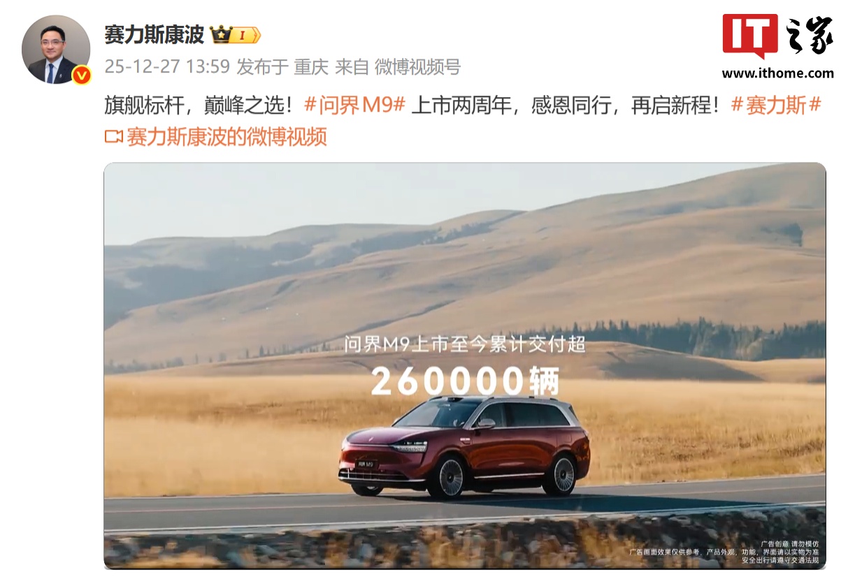 IT之家 12 月 28 日消息,赛力斯集团副总裁康波昨日发布了鸿蒙智行问界 M9 上市两周年的宣传视频,其中提到问界 M9 上市至今累计交付超 26 万辆。