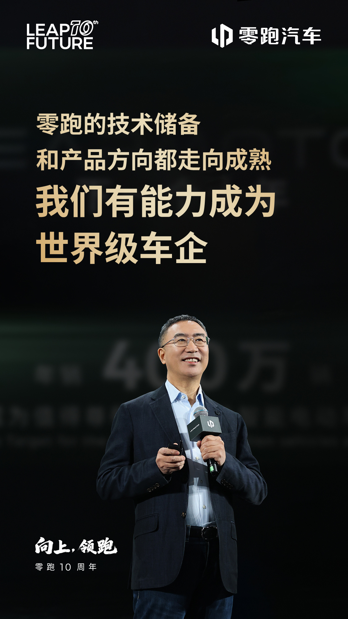 发布会上,朱江明公布了零跑下一个十年的目标:年销 400 万辆,成为值得尊敬的世界级智能电动车企。