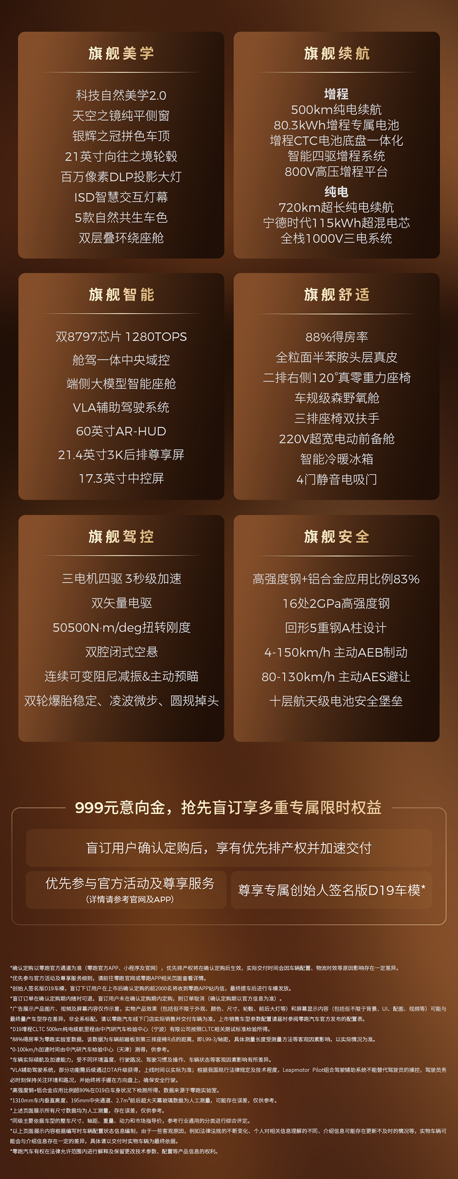 IT之家此前报道,零跑 D19 已于 11 月 1 日正式开启盲订,支付 999 元意向金可享优先排产、限量 2000 份创始人签名 D19 车模及后续活动优先参与权 + 尊享服务在内的多项权益。