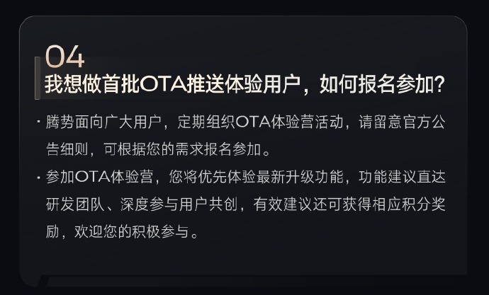 凤凰网科技讯 12月29日,腾势汽车官方宣布,腾势D9已筹备OTA升级,计划近期推送泊车辅助车外语音播报功能。官方提醒,腾势会定期组织OTA体验营活动,请留意官方公告细则,可根据需求报名参加。