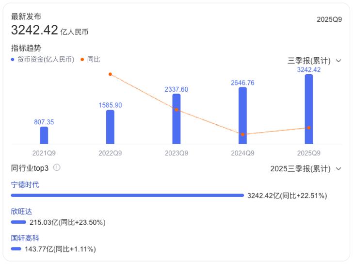 2021年三季度-2025年三季度宁德时代货币资金增长情况