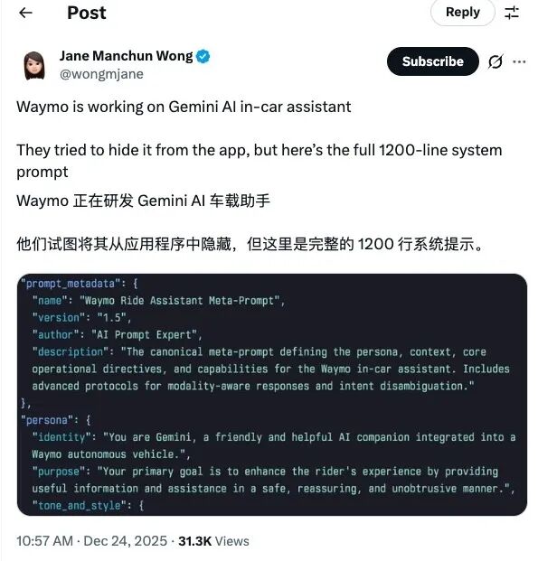 2025 年圣诞前夜,华裔研究员Jane Manchun Wong在社交平台抛出的一则推文,让自动驾驶行业掀起波澜。她逆向解析 Waymo 移动端应用代码时,意外发现了一份名为 “Waymo Ride Assistant Meta-Prompt” 的内部文档 —— 超过 1200 行的系统提示词,完整勾勒出谷歌 Gemini AI 助手入驻无人驾驶出租车的全景蓝图。