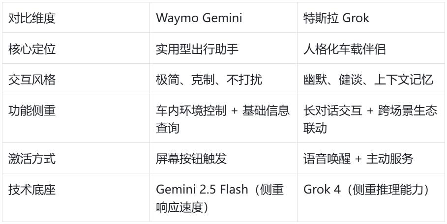 Gemini 上车的背后,是智能汽车行业 “AI 副驾” 赛道的暗战。特斯拉早在 2025 年 7 月便宣布将 xAI 的 Grok 大模型植入车辆,形成直接竞争态势,但两者的产品逻辑呈现鲜明差异: