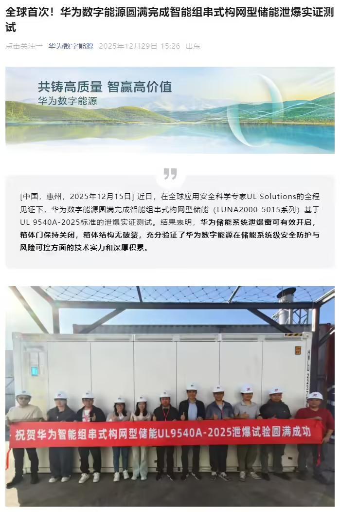 凤凰网科技讯 12月29日,华为数字能源宣布,其智能组串式构网型储能(LUNA2000-5015系列)已于近日,在全球应用安全科学专家UL Solutions的全程见证下,成功完成基于UL 9540A-2025标准的泄爆实证测试。