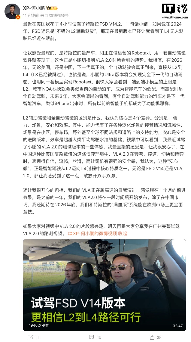 IT之家 12 月 30 日消息,小鹏汽车董事长何小鹏在微博发文称,最近在美国他花了 4 小时试驾了特斯拉 FSD V14.2,一句话小结:如果说在 2024 年,FSD 还只是“不错的 L2 辅助驾驶”,那现在最新版本已经让他看到了 L4 无人驾驶已经近在眼前。