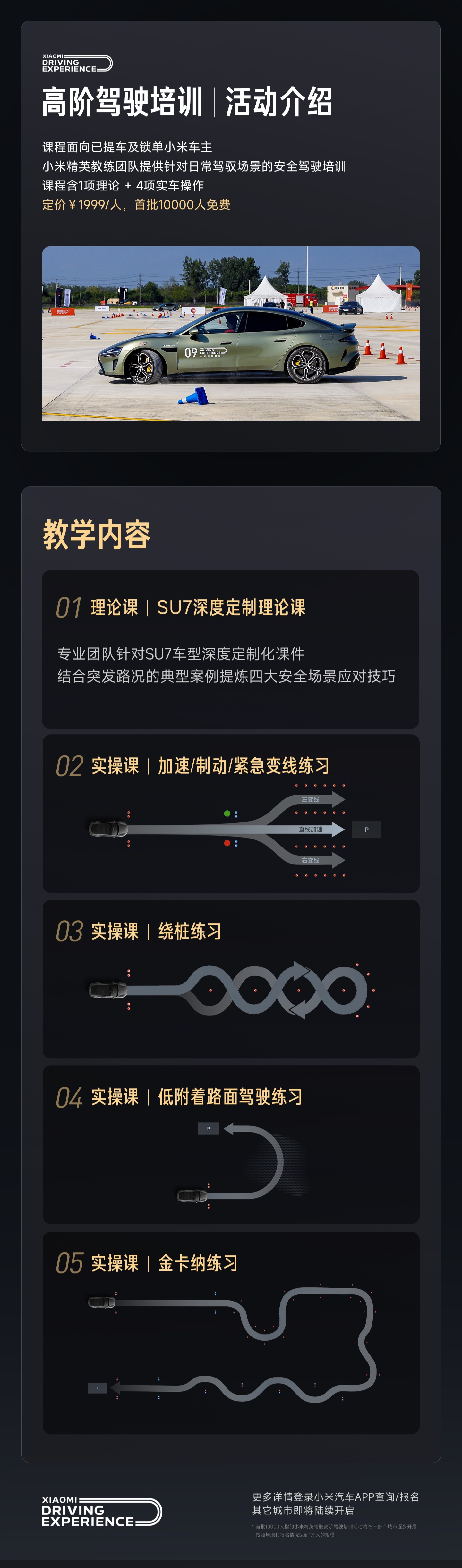参考过往小米精英驾驶・高阶驾驶培训来看,该活动包含 1 项理论及 4 项实车操作课程,车主可驾驶小米 SU7,在加速制动练习、绕桩、湿滑路面和金卡纳训练等项目中,积累驾驶经验,提升安全驾驶能力。IT之家附教学内容如下: