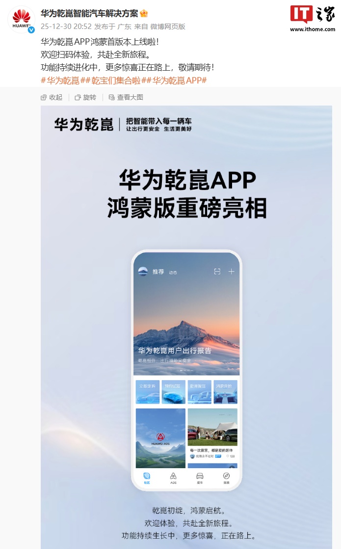 IT之家 12 月 31 日消息,华为乾崑智能汽车解决方案昨晚宣布,华为乾崑 App 鸿蒙首版本上线。官方表示:“功能持续进化中,更多惊喜正在路上,敬请期待!”