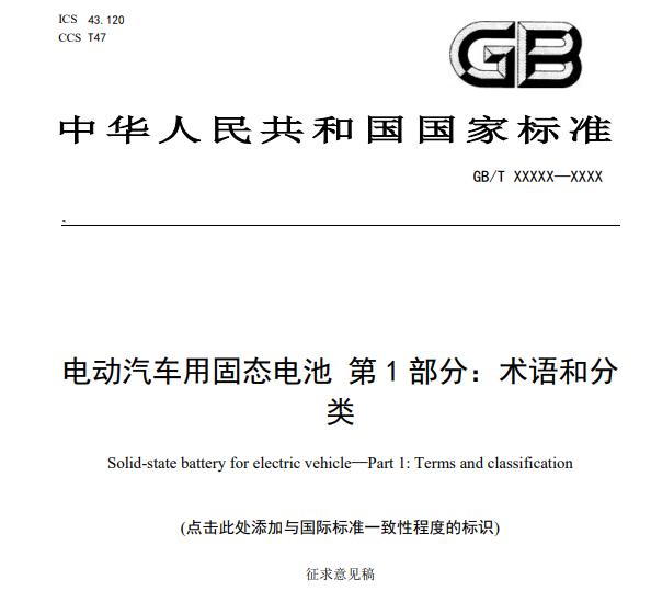 据报道,12 月 30 日,固态电池首个国家标准 ——《电动汽车用固态电池第 1 部分:术语和分类》公开征求意见。征求意见稿明确了固态电池的相关术语、分类、编码等基础内容。
