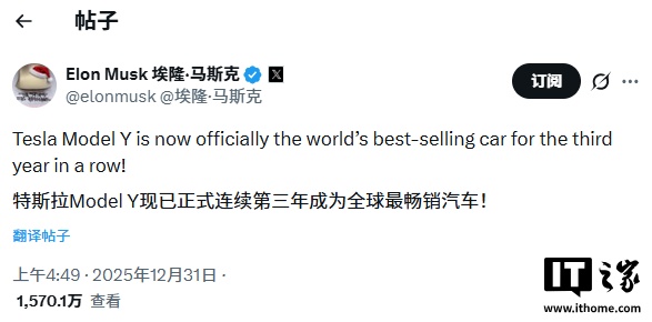 IT之家 12 月 31 日消息,埃隆・马斯克宣布,特斯拉 Model Y 车型已连续第三年蝉联全球最畅销汽车桂冠,以又一统治级表现为 2025 年收官。