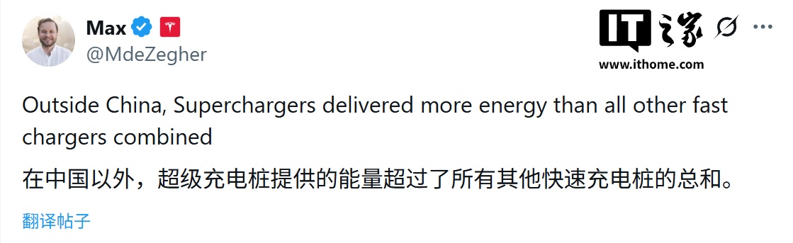 特斯拉的全球充电业务高管 Max de Zegher 随后转发该推文,并表示在中国市场外,超级充电桩提供的能量超过了所有其他快速充电桩的总和。