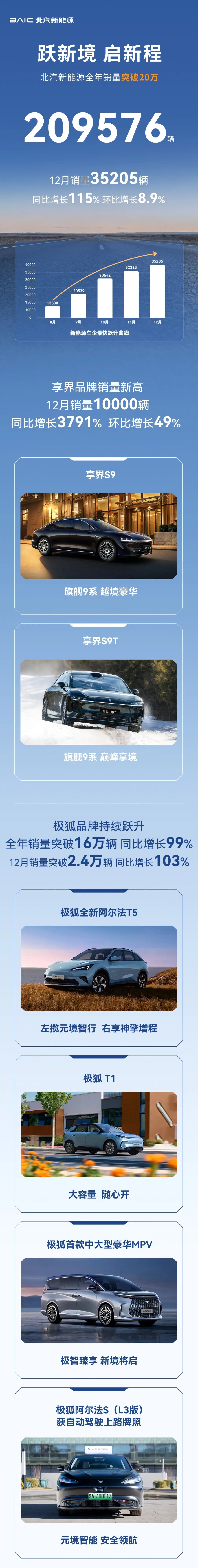 极狐品牌全年销量突破 16 万辆,同比增长 99%,连续 3 年实现销量翻番;12 月单月销量突破 2.4 万辆,同比增长 103%。