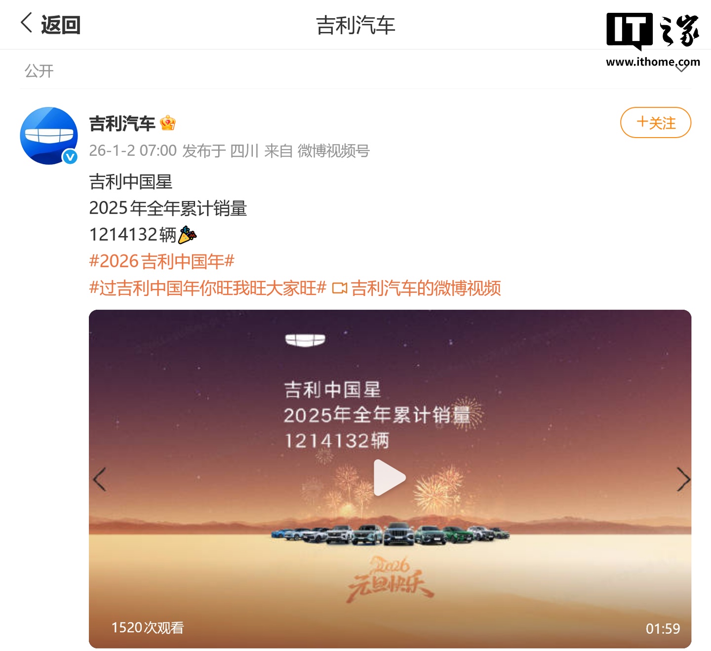 IT之家 1 月 2 日消息,@吉利汽车 官方账号今天(1 月 2 日)发布微博,宣布吉利帝豪 2025 年热销 183855 辆,上市以来全球销量突破 415 万辆。吉利中国星 2025 年全年累计销量 1214132 辆。