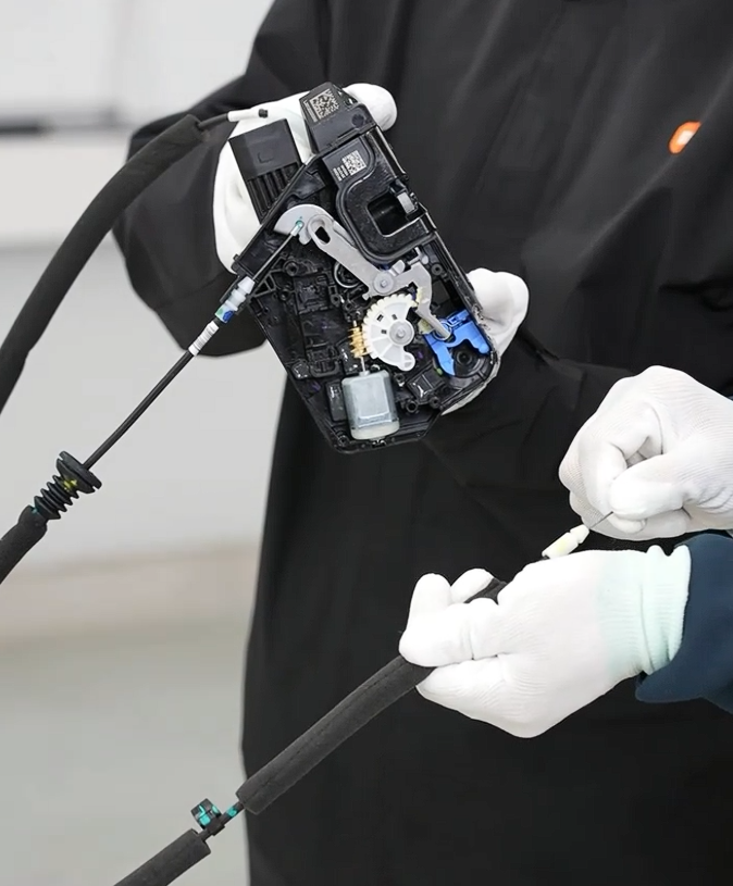 小米展示了 YU7 的门锁设计,该车的外部门锁采用了内翻式设计,内部则配有应急的机械开门拉手,官方展示了内部和外部的机械拉线,并演示了工作原理。