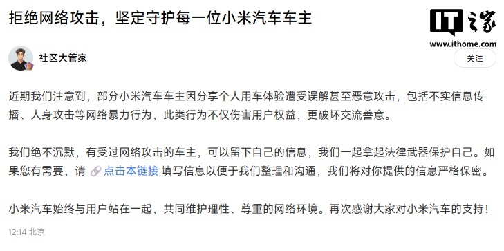 IT之家注意到,去年 9 月 26 日,小米官方在小米汽车社区发文 ——《拒绝网络攻击,坚定守护每一位小米汽车车主》,提到有受过网络攻击的车主,可以留下自己的信息,一起拿起法律武器保护自己。