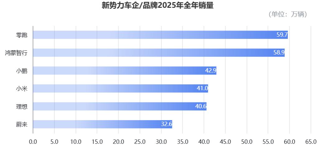 头部新势力里,只有理想一家受转型影响而同比下滑,2025年销量为40.6万辆,同比下滑18.8%。