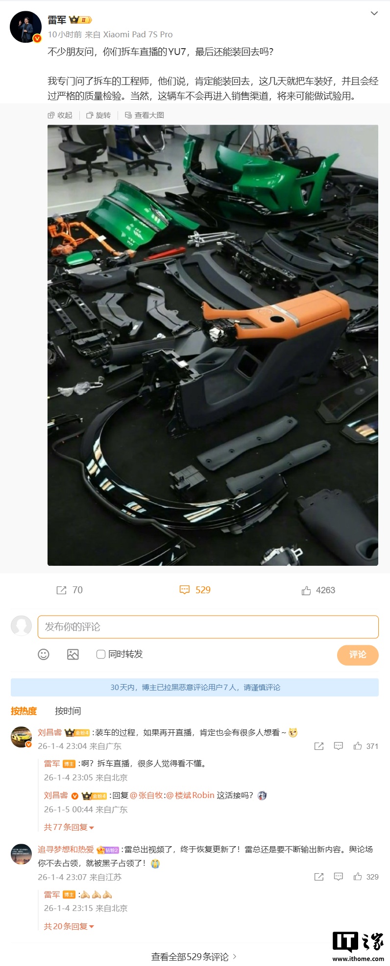 对于这台拆过的 YU7 如何处理,雷军昨晚发文称: