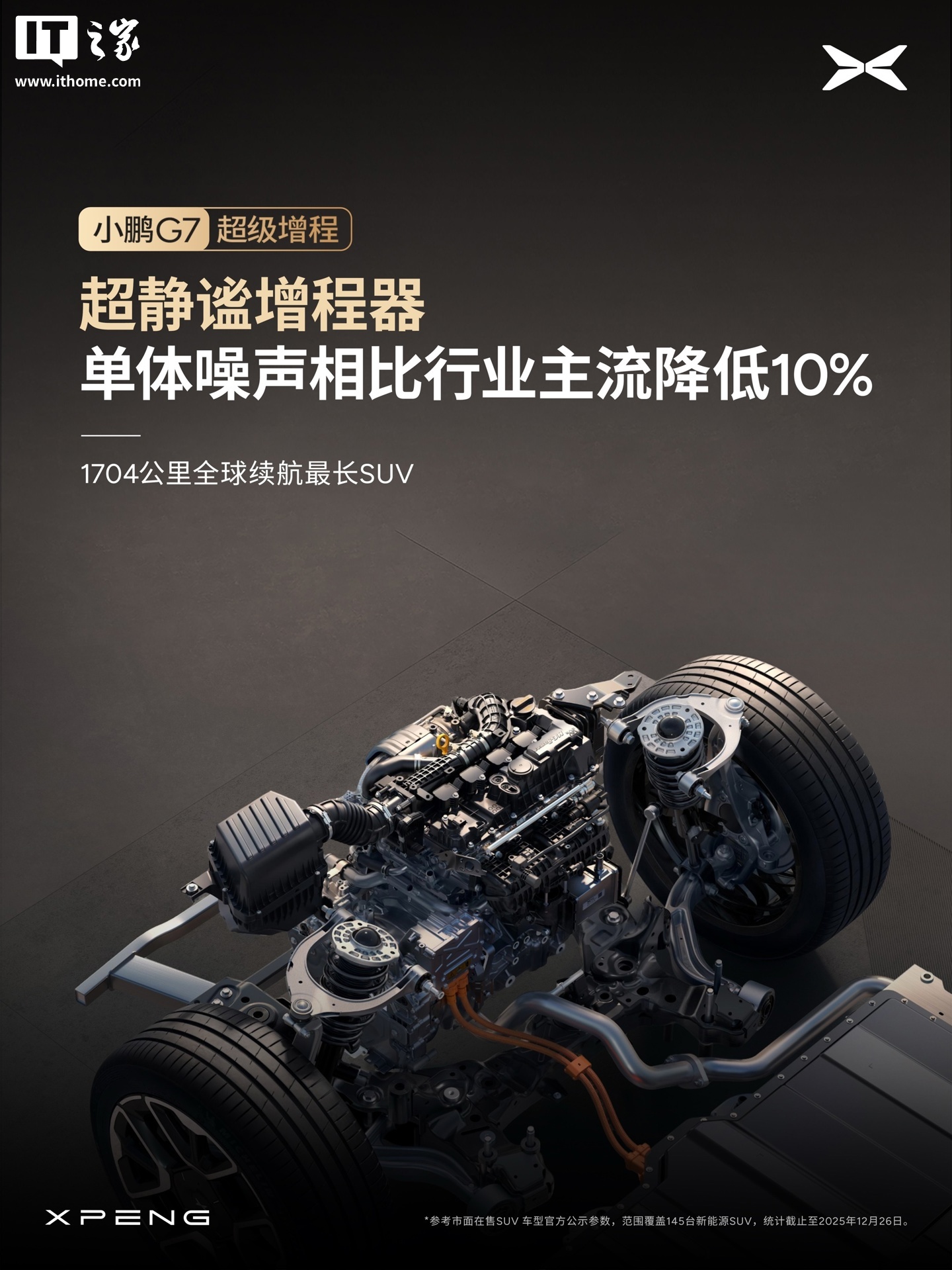 IT之家 1 月 5 日消息,小鹏汽车官方今日继续预热 G7 超级增程 SUV,本次着重介绍了新车的降噪能力。据介绍,小鹏 G7 超级增程全系标配主动降噪技术 ENC+RNC,噪音最高降低 50%。