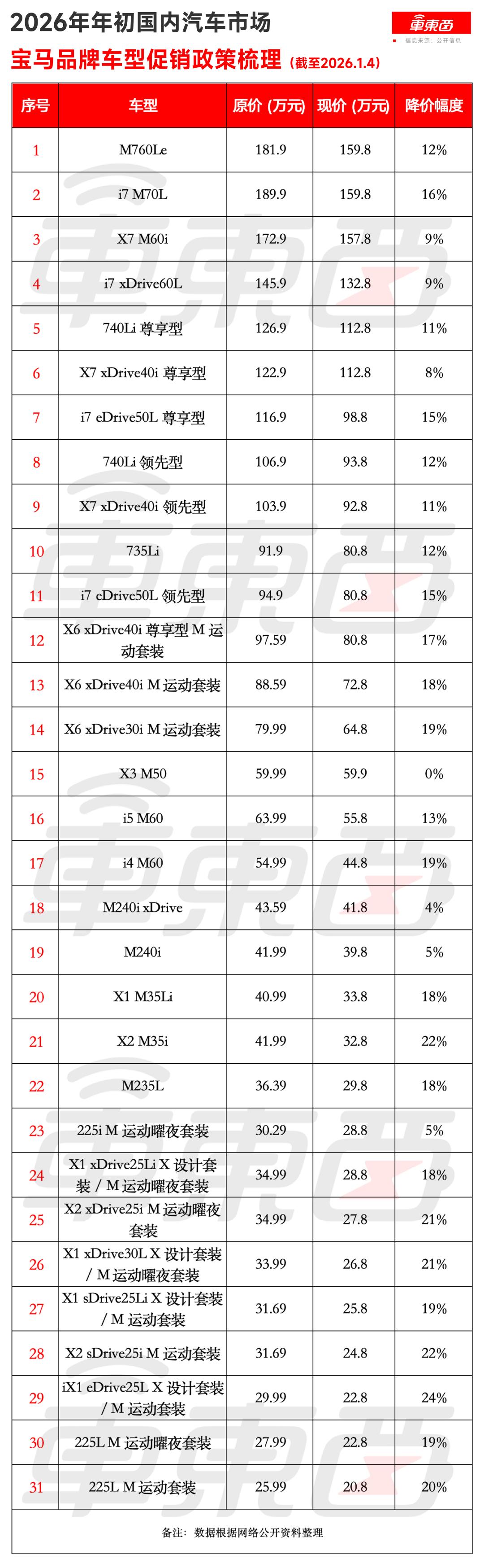 车东西1月4日消息,元旦刚过,宝马汽车就官宣了一波密集的优惠政策,对旗下31款车型下调了指导价,最多狂降30.1万元,打响了开年车市价格战第一枪。