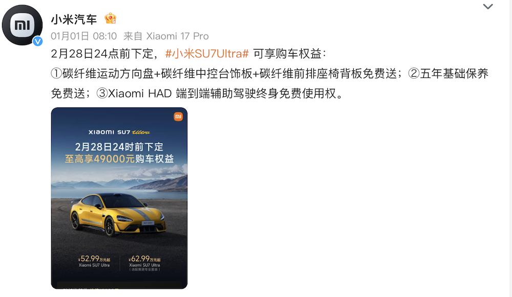 小米还为SU7 Ultra用户进一步加码,赠送碳纤维运动方向盘+碳纤维中控台饰板+碳纤维前排座椅背板、五年基础保养免费送、Xiaomi HAD 端到端辅助驾驶终身免费使用权。