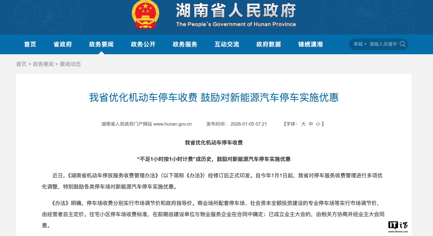 IT之家 1 月 5 日消息,据湖南省人民政府官网,《湖南省机动车停放服务收费管理办法》自今年 1 月 1 日起印发实行,主要对停车服务收费管理进行多项优化调整,同时特别鼓励各类停车场对新能源汽车停车实施优惠。