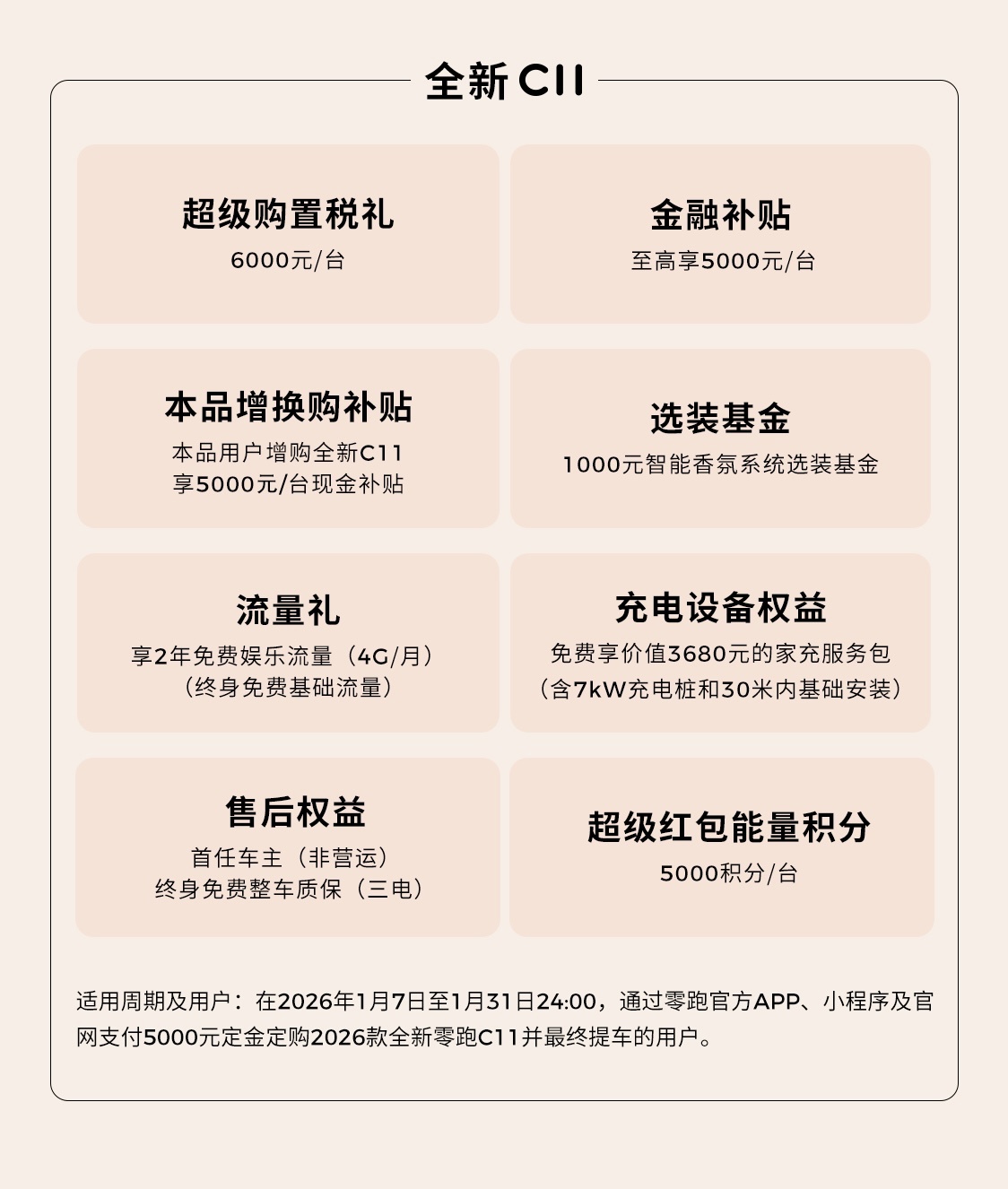 即日起到 2026 年 1 月 31 日 24:00 期间,支付 5000 元定金定购 2026 款零跑 C11 并最终提车的用户可享至高 5000 元 / 辆金融补贴、6000 元 / 辆超级购置税补贴、5000 元 / 辆本品增换购补贴、1000 元智能香氛系统选装基金、超级红包能量积分 5000 积分 / 辆、价值 3680 元家充服务包限时免费(含 7 千瓦充电桩和 30 米内基础安装)、2 年免费娱乐流量(4G / 月,基础流量终身免费)、首任非营运车主终身免费整车质保(含三电)。