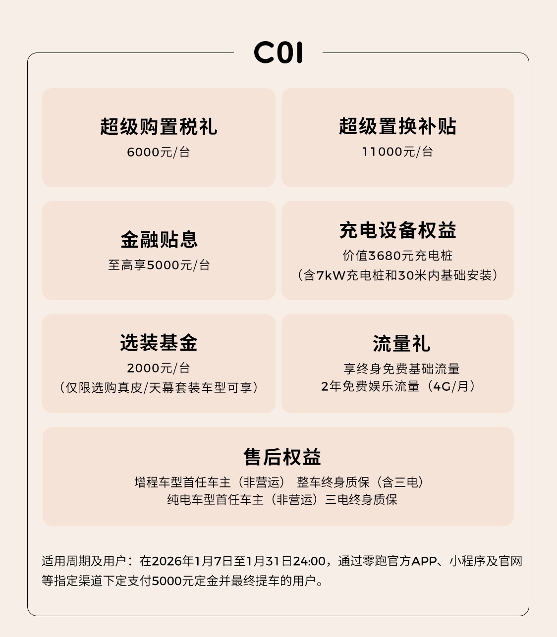 即日起到 2026 年 1 月 31 日 24:00 期间,支付 5000 元定金定购零跑 C01 并最终提车的用户可享 11000 元 / 辆超级置换补贴、6000 元 / 辆超级购置税补贴、至高 5000 元 / 辆金融贴息、2000 元 / 辆选装基金(仅限选购真皮 / 天幕套装车型可享)、价值 3680 元家充服务包限时免费(含 7 千瓦充电桩和 30 米内基础安装)、增程车型首任非营运车主整车终身质保(含三电)、纯电车型首任非营运车主三电终身质保、2 年免费娱乐流量(4G / 月,基础流量终身免费)。