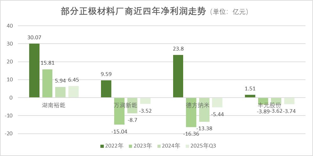 以开头提到的湖南裕能、万润新能和德方纳米为例,过去两三年,他们的利润大都呈现下滑趋势。净利润率不仅比不上宁德时代等电池企业,甚至大多数还处于亏损状态。