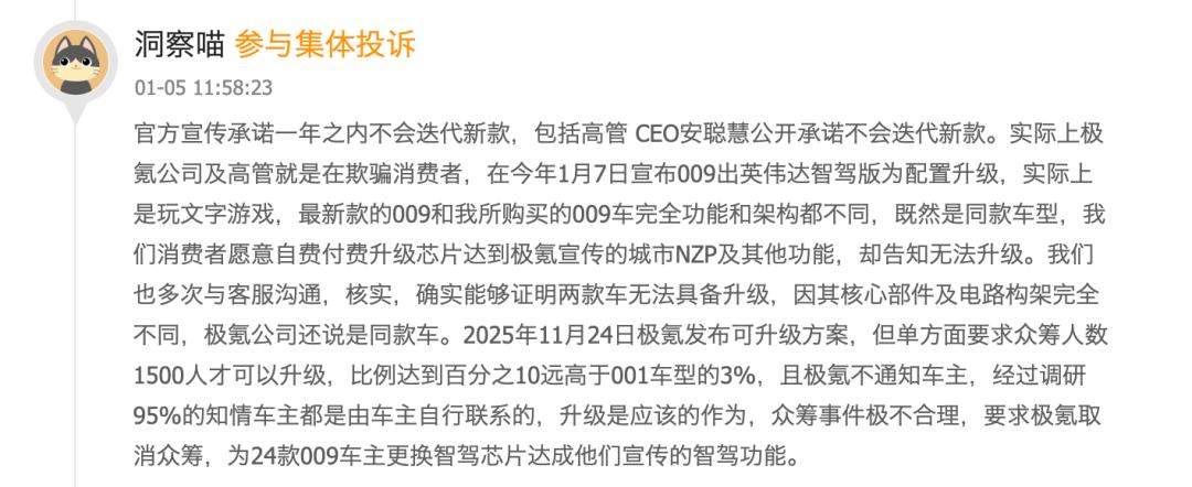 在购置税兜底风波之外,近期在黑猫投诉平台上,不少极氪009车主集体投诉新车“背刺”事件。