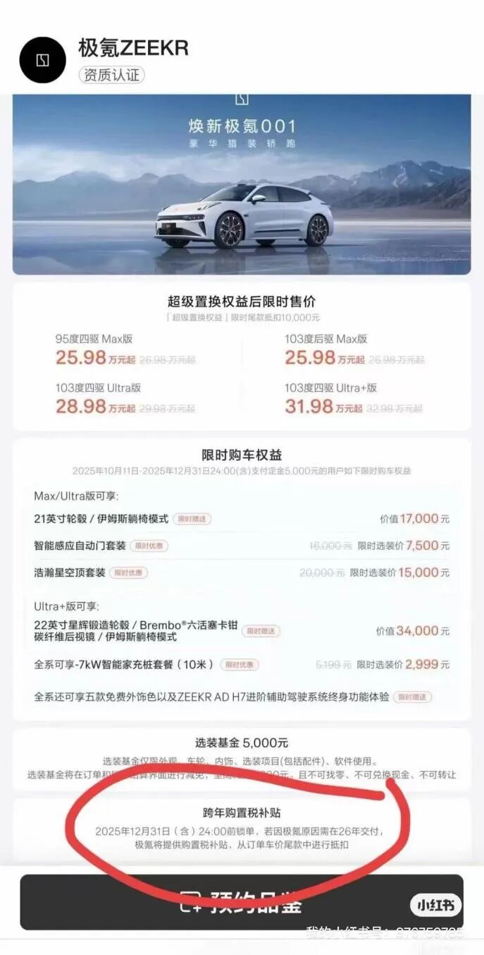 在去年下半年,极氪就上线了一个“跨年购置税补贴”,称只要在2025年12月31日24点前锁单,如因极氪原因导致车辆在2026年开票交付,极氪也将提供购置税补贴,并在订单车辆尾款中予以抵扣。