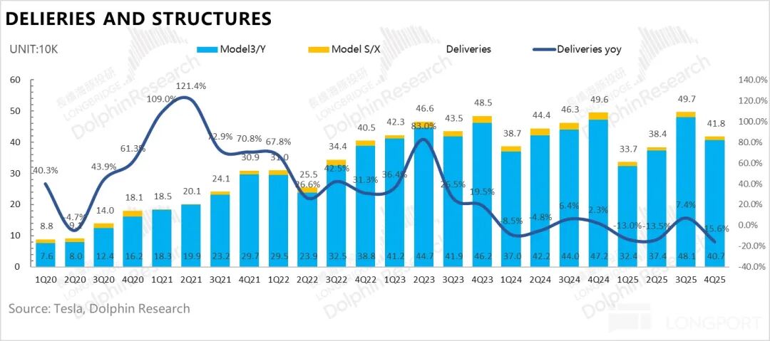 2026 年 1 月 2 日,特斯拉四季度交付数据出炉,结果如市场预期的那样 “惨淡”。受美国 IRA 法案 7500 美元补贴退坡、中国购置税退坡及 “以旧换新” 红利耗尽的双重挤压,其 Q4 交付量仅 41.8 万辆,环比下滑 16%;2025 年全年交付 164 万辆,同比下滑 8.6%,迎来连续第二个财年销量萎缩。