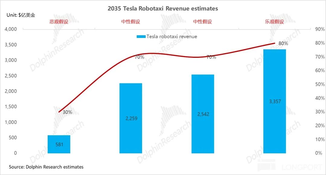 b. 中性假设(大概率):定价$0.75-$1/mile,凭借垄断优势独占 70% 份额,贡献 2035 年收入 2200-2600 亿美元(当前收入的 2-2.5 倍)。