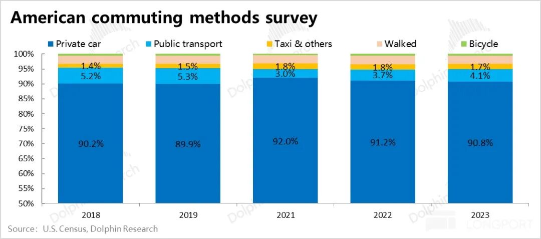 在美国,私家车同样是居民通勤的绝对主力:根据美国普查局数据,私家车通勤占比接近 91%,公共交通占比仅 3%-5%,传统出租车 + 共享出行的占比不足 2%(仅覆盖通勤场景)。