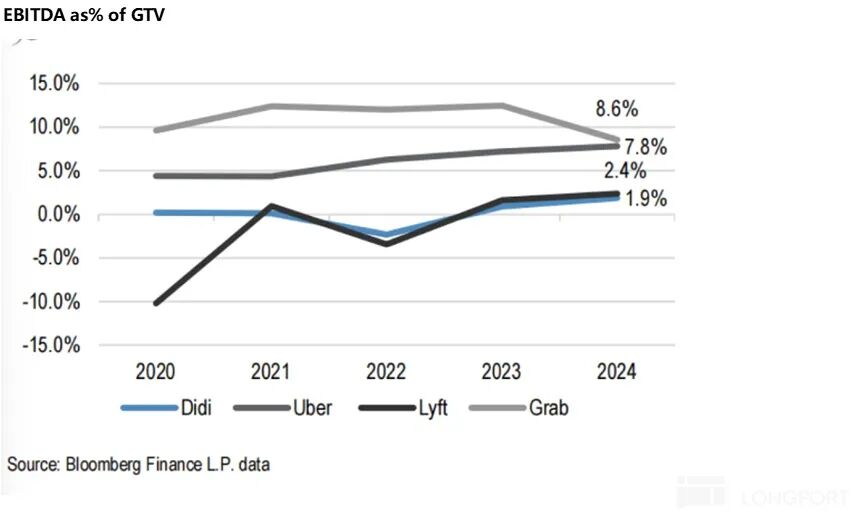 行业领头羊 Uber 凭借全球化规模效应、外卖等第二增长曲线的协同,其 EBITDA/GTV 虽为行业最高,但仍未突破 10%,而滴滴的利润率就更低仅低个位数。