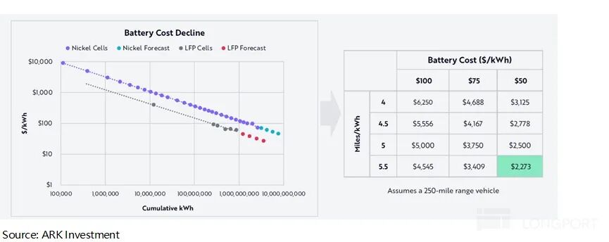 而 ARK 预计的更为乐观,考虑到 Cybercab 极致的能效比(5.5 英里/kWh)以及电池成本的持续下行(有望降至 $2,300/车),ARK Invest 认为 Cybercab 的总生产成本甚至能击穿至 1.5 万美元以下。