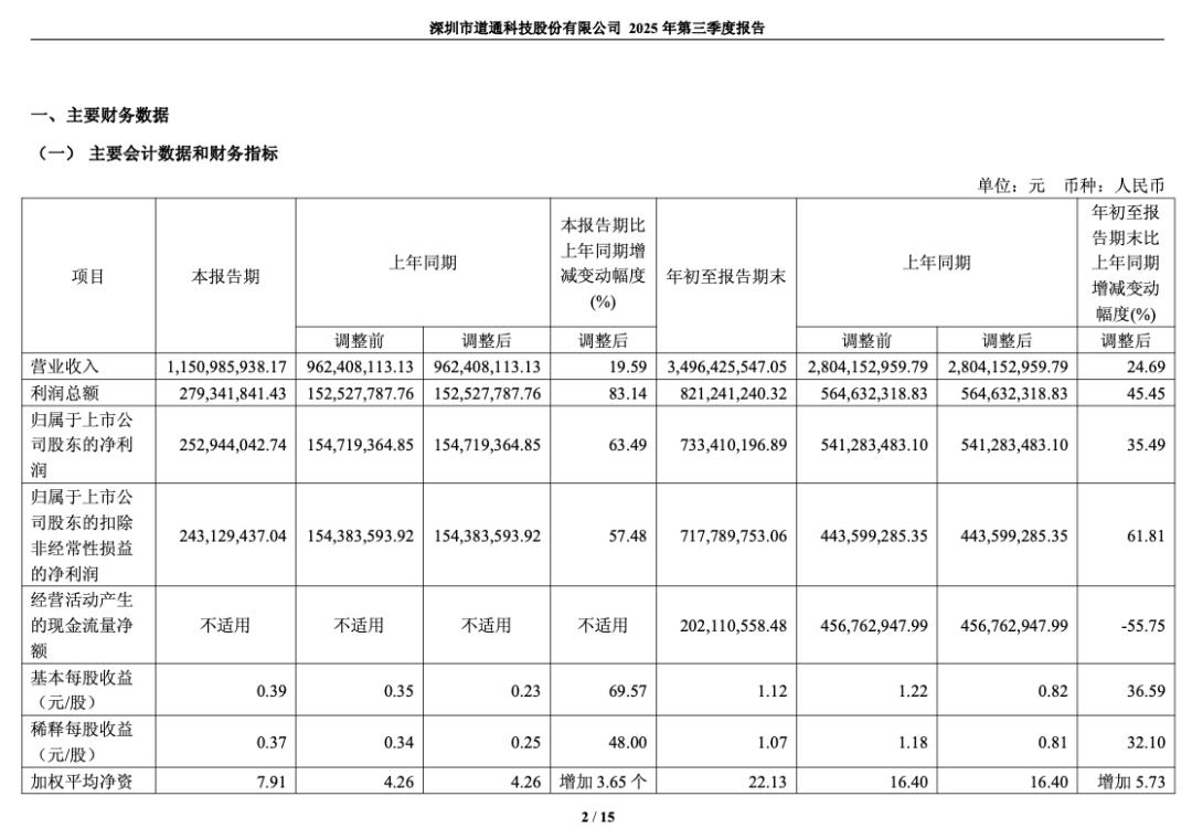 2025年前三季度,道通科技实现营业收入34.96亿元,同比增长24.69%;归母净利润7.33亿元,同比增长35.49%;扣非后归母净利润达7.18亿元,同比增长高达61.81%。