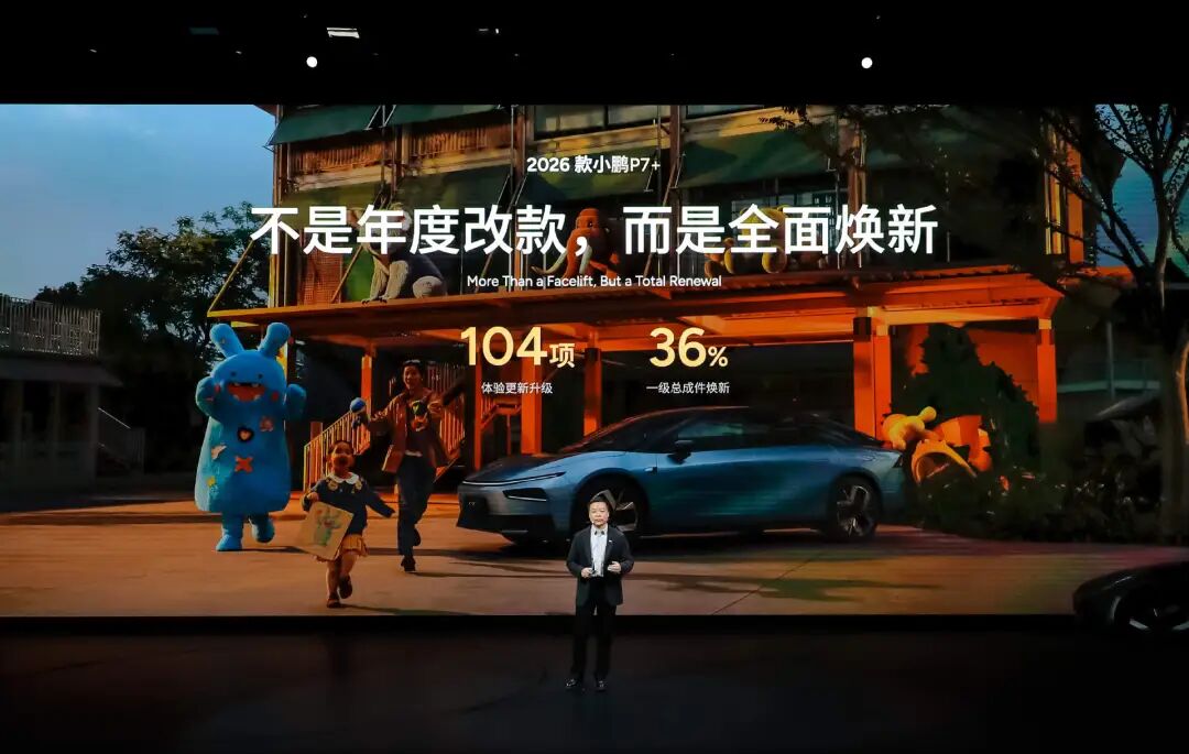 两台车的纯电版,虽然都是年度改款,但号称“改款堪比换代”,尤其是小鹏 P7+,因为按照何小鹏的说法,2026 款小鹏 P7+ 进行了104 项用户体验相关的更新升级,36%的一级总成件焕新。