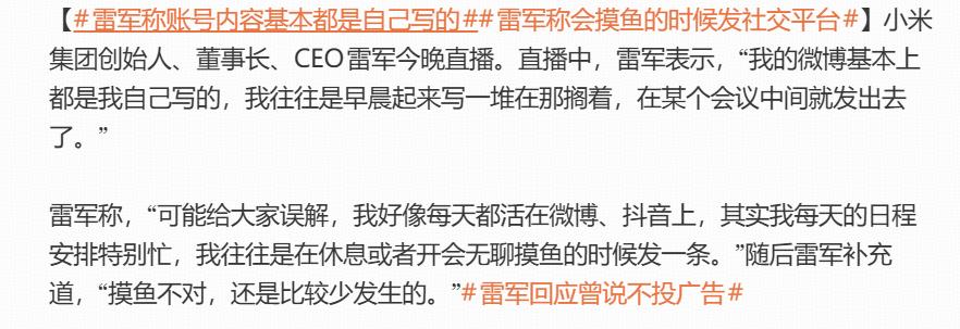 这也不难理解,对于雷军这样既能带流量、又能拉投放的标志性IP,平台自然会主动保护。毕竟,雷军和小米,早就成了微博的“流量压舱石”。
