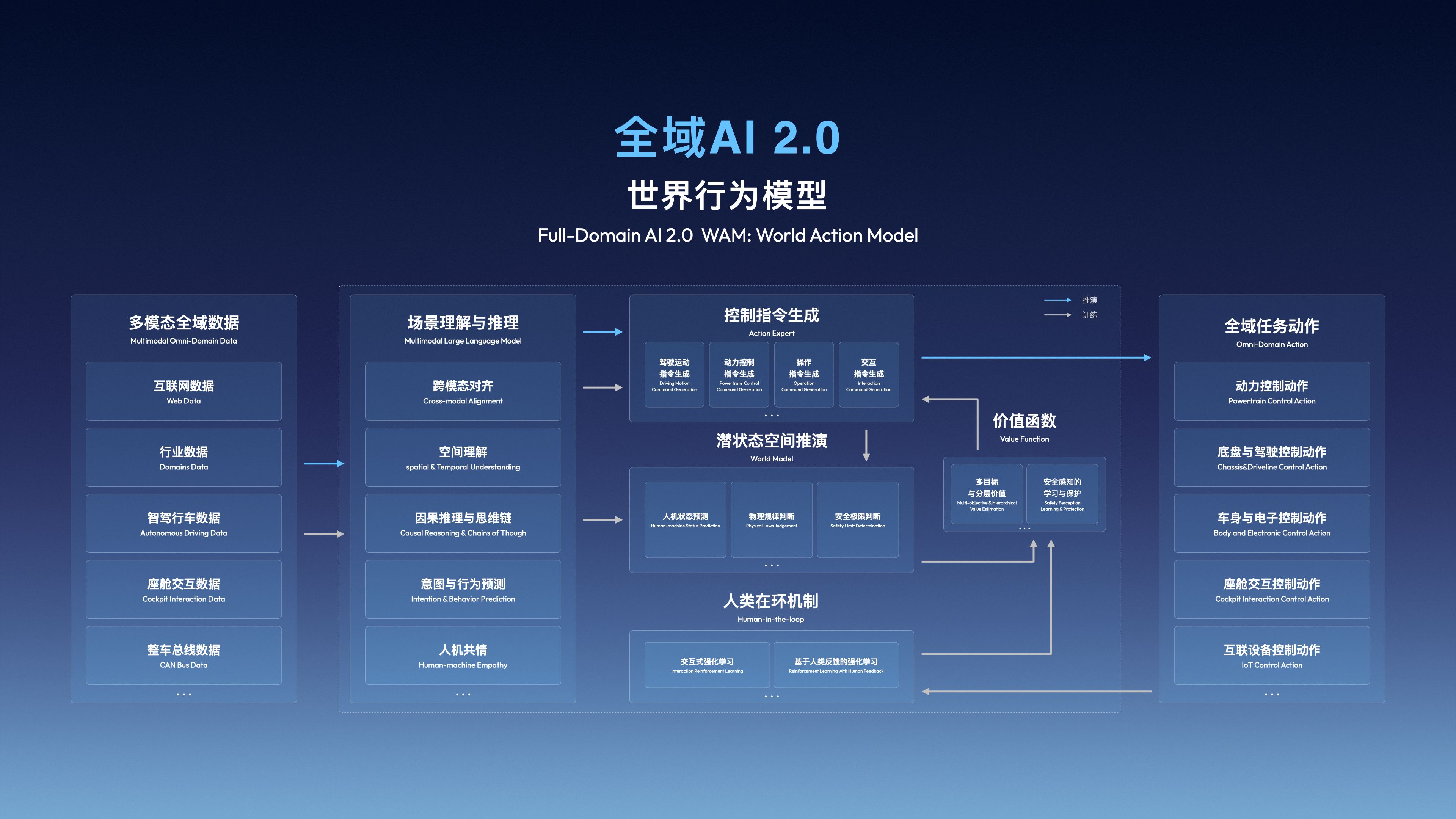 淦家阅:我们的WAM世界行为模型的能力,远不止应用在辅助驾驶方面,可以做到多域融合调动,效率非常高。这是辅助驾驶角度。那么辅助驾驶和底盘域、动力域之间的调动,以前做得不够丝滑,现在可以通过WAM做到整车各域的融合。
