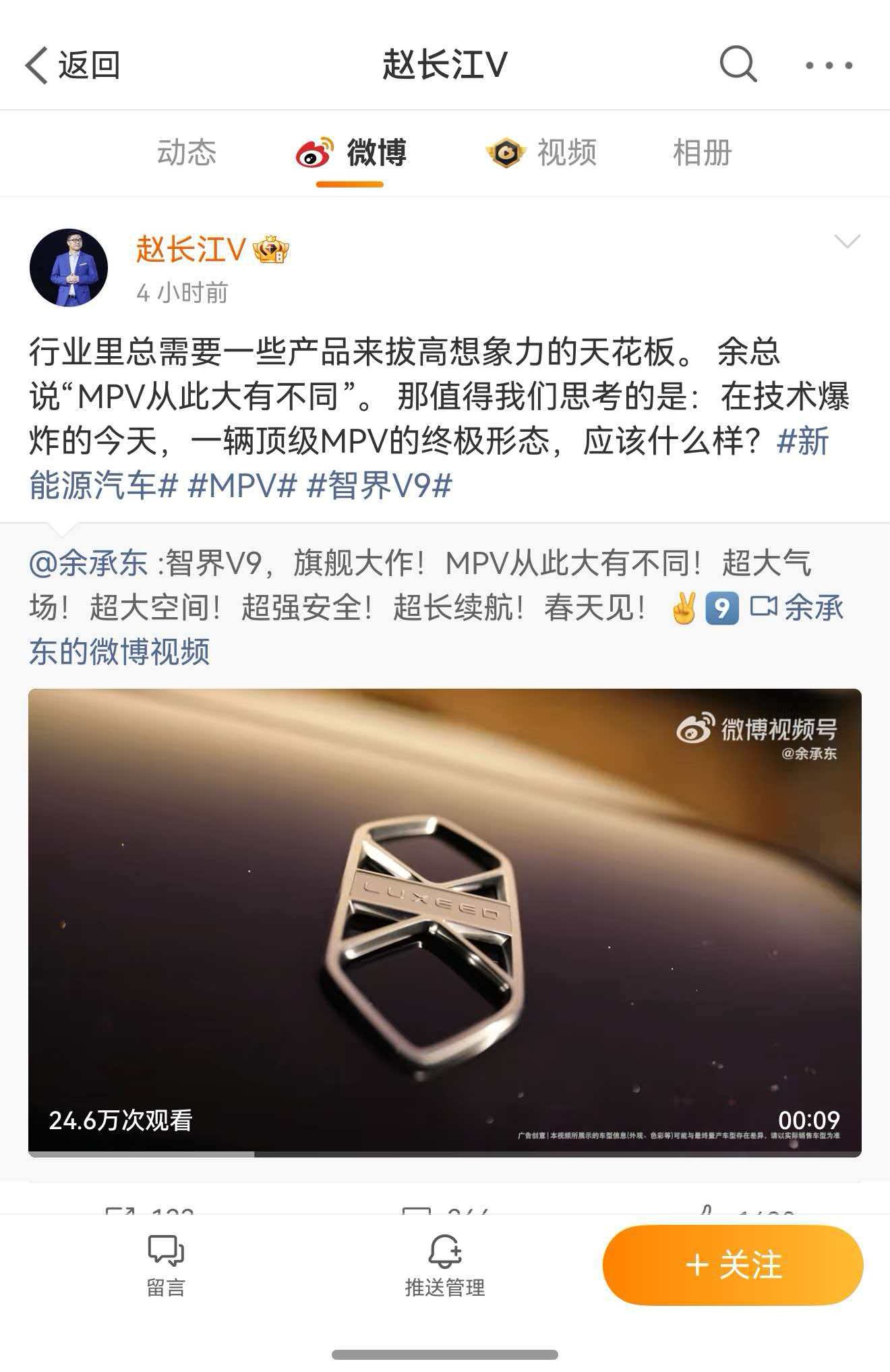 C114讯 北京时间1月9日下午消息(蒋均牧)今日上午,华为常务董事、终端BG董事长余承东在微博发文,正式官宣智界V9并称春天见。