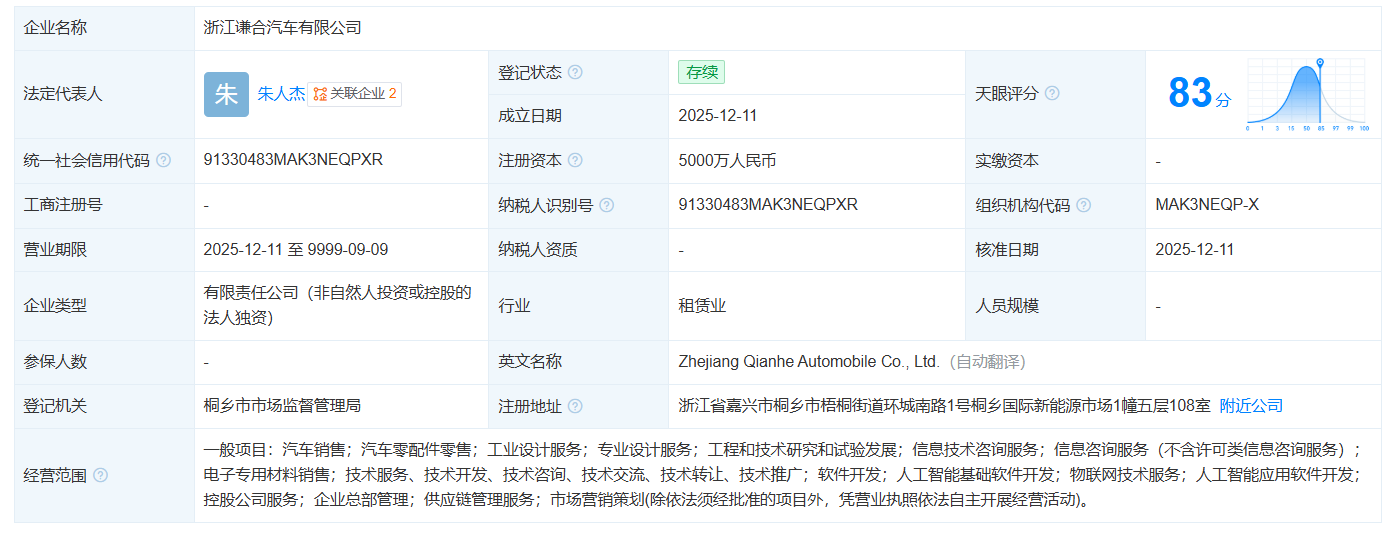 天眼查显示,12月11日,浙江谦合汽车有限公司正式成立,注册资本为5000万元,主要经营业务包括汽车销售、汽车零配件零售、工业设计服务、工程和技术研究和试验发展、电子专用材料销售、软件开发、人工智能基础软件开发等。