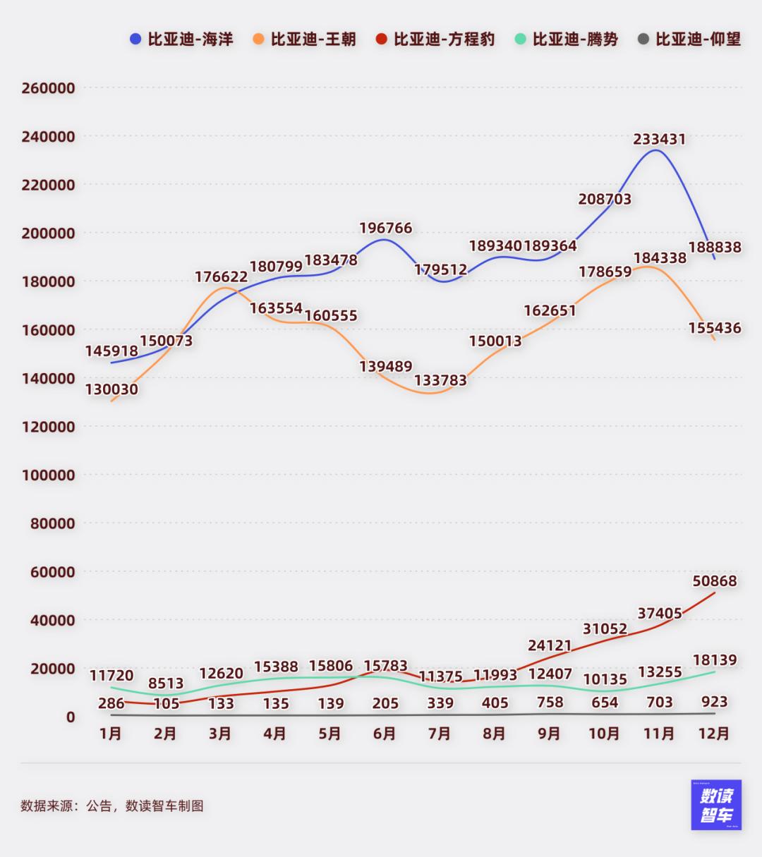 另一方面,比亚迪在悄然壮大其他产品线。方程豹是最直观的体现,12月,方程豹销量达到50868台,大幅度创造新高。这个销量水平已经远超一众品牌。也侧面印证了比亚迪的雄厚实力。
