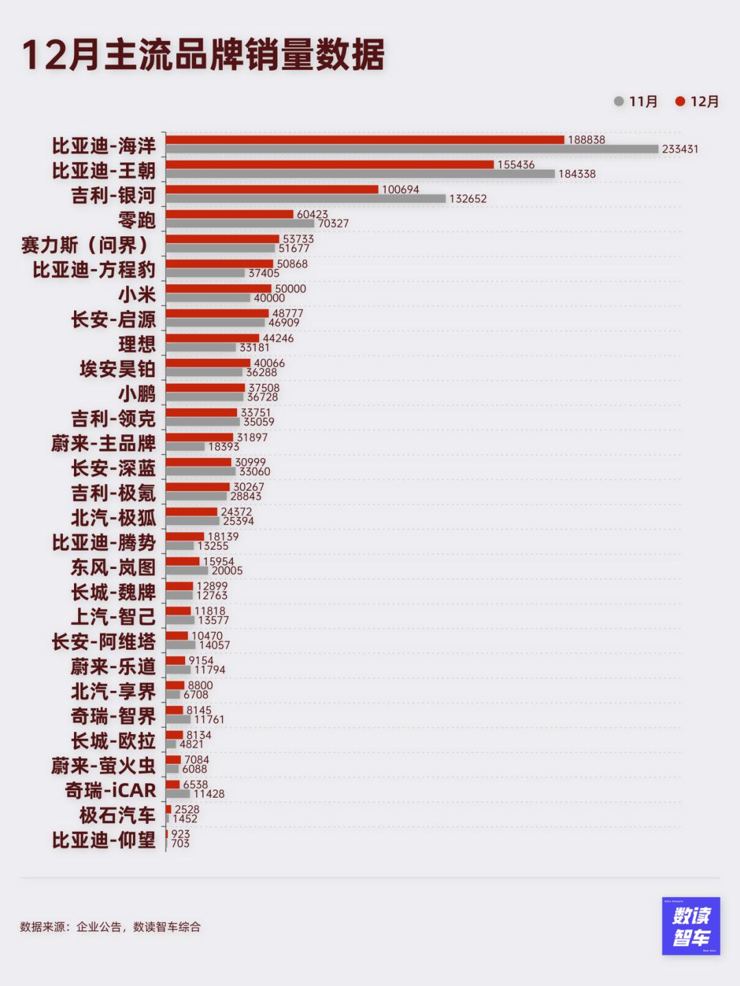 头部品牌中,比亚迪王朝、海洋系列,吉利银河系列月销稳定破10万台。零跑、问界、小米、方程豹成为月销破5万台的品牌,5万+的品牌阵营从11月的5个,增加到7个。