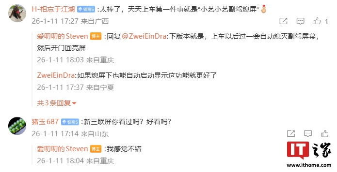 有网友希望熄屏下也能自动启动显示,博主在评论区回复称,下个版本还将支持上车以后过一会自动熄灭副驾屏幕,然后开门亮屏的特性。