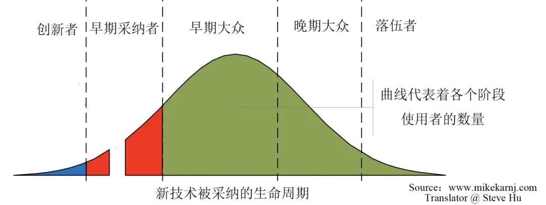 营销学上有个著名的 「技术采纳生命周期」 理论——任何创新产品的普及都会经历几个阶段:从热衷尝鲜的 「创新者」,到具备前瞻眼光的 「早期使用者」,再到务实的 「晚期大众」。