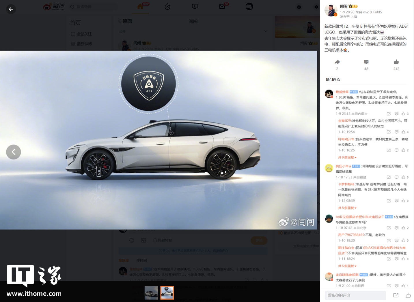 在官方分享的侧身照中可以看到新车的 B 柱上印有文字图案,但受限于图片清晰度,具体内容无从得知。IT之家注意到,博主 @闫闯 揭晓了这个“谜底”,他透露,新款阿维塔 12 车侧 B 柱带有“华为乾崑智行 ADS”LOGO(博主的图片显示为“乾崑智驾 ADS”LOGO,未带华为字样)。