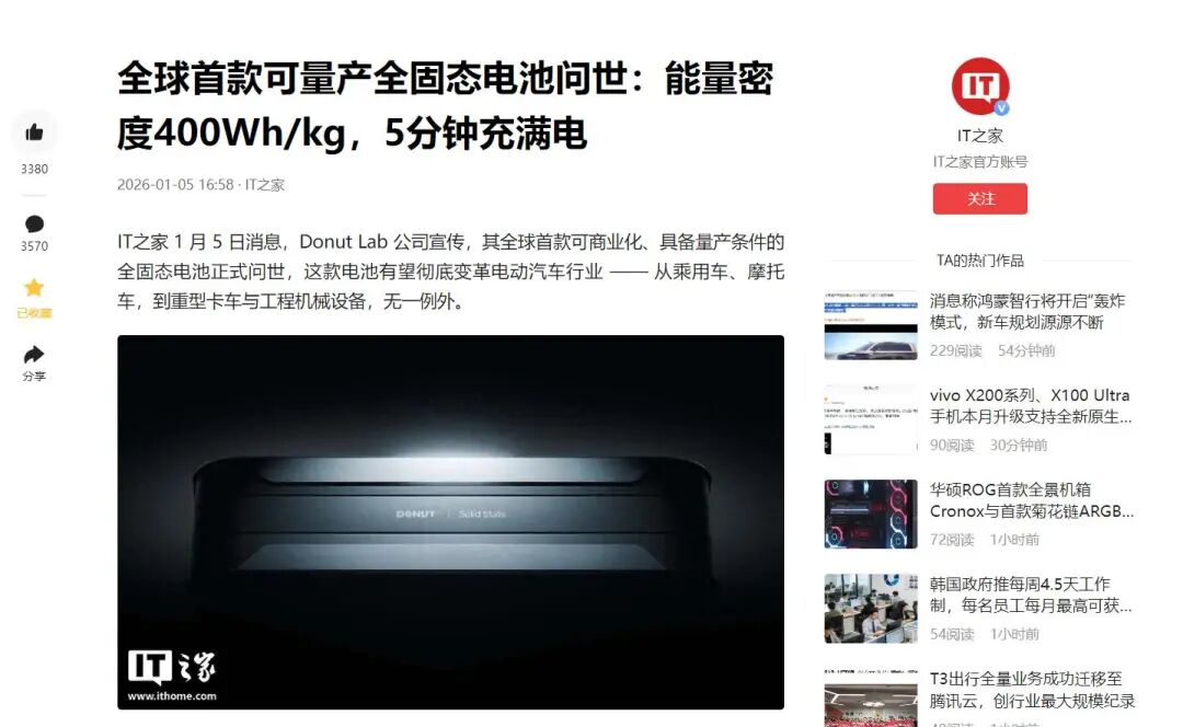 中日韩在固态电池赛道上已经暗战多年,都想抢到固态电池首发权,没想到半路杀出个程咬金,2026年1月6日,芬兰初创电动出行技术公司Donut Lab率先发布了固态电池。