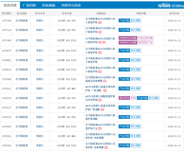 快科技1月12日消息,汽车第三方投诉平台车质网显示,北汽极狐T1遭车主集体投诉,投诉原因普遍为“底盘减配护板,高压线束裸露在外”,涉及车型均为2025款极狐T1。