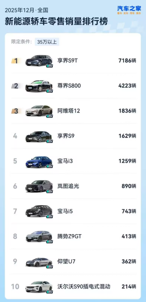 但享界S9T的后发优势鲜明,12月的销量已冲到了7186辆,连续3个月位居榜单第四,销量直追宝马5系。