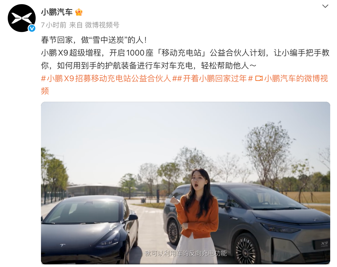 凤凰网科技讯 1月13日,小鹏汽车官方宣布启动1000座”移动充电站“公益合伙人计划。该计划将招募1000名小鹏X9超级增程车主,利用车辆V2V放电能力,为春运途中那些急需充电的新能源车主“保驾护航”。