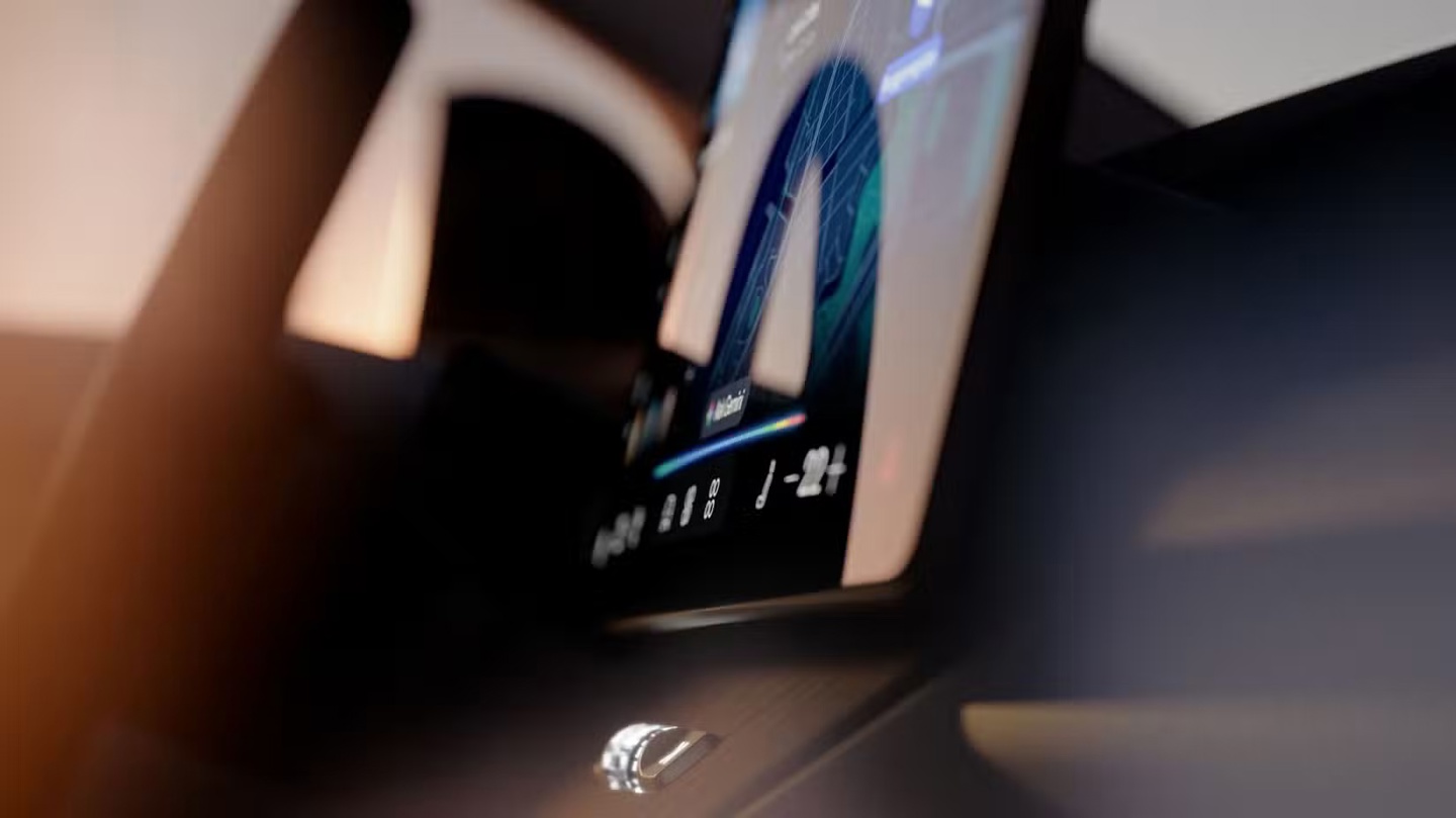 IT之家注意到,图中能看到的唯一物理控制部件,是中控屏下方的一个小滚轮。该滚轮带有背光,两侧或许配有按键,大概率用于控制音响的音量调节与播放 / 暂停等基础功能。滚轮采用高亮背光设计,周围环绕着疑似开放式纹理的木质饰板。在画面背景中,还能隐约看到方向盘后方的仪表盘屏幕,但因屏幕处于熄灭状态且画面较为模糊,无法辨识具体细节。